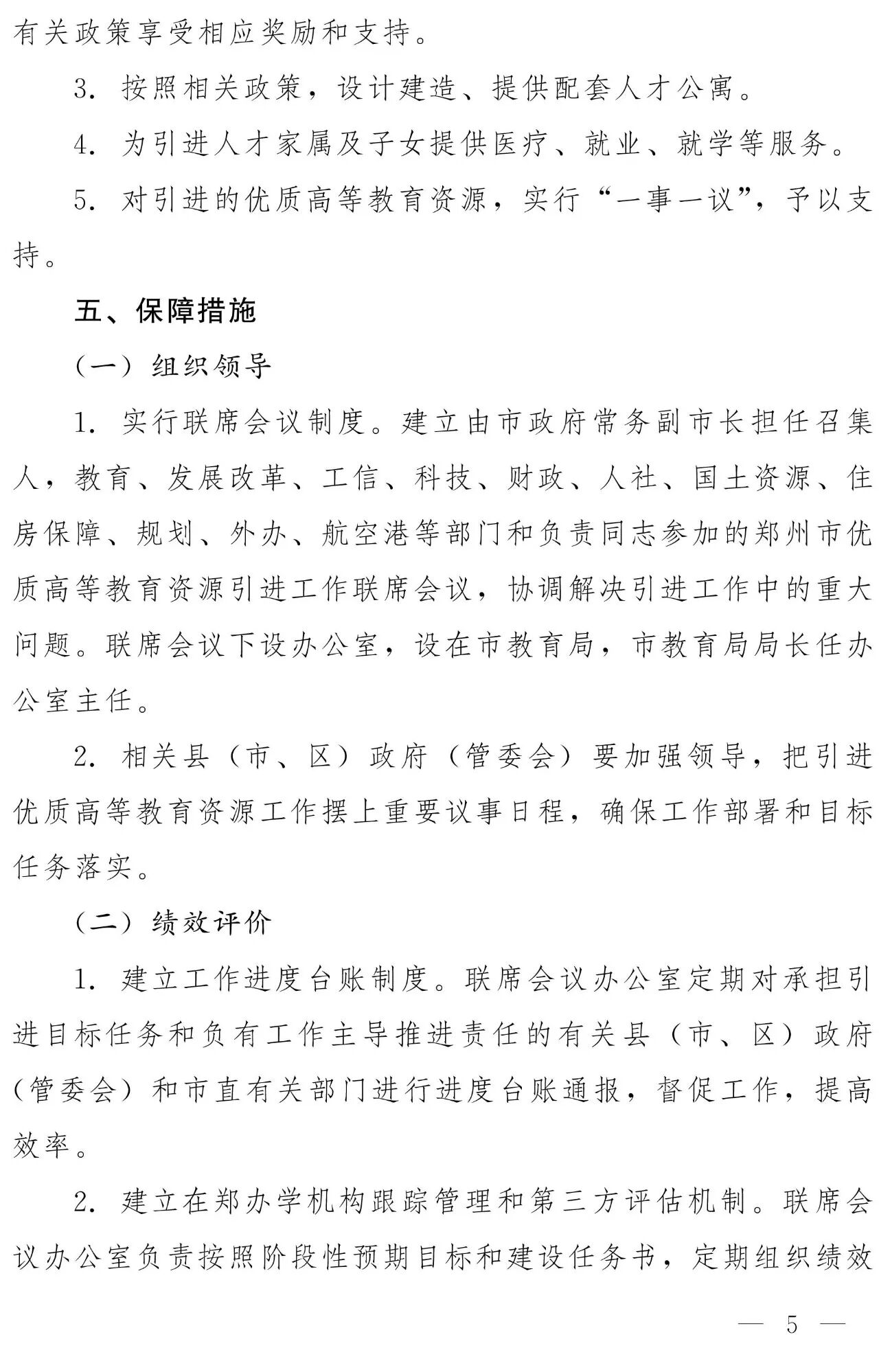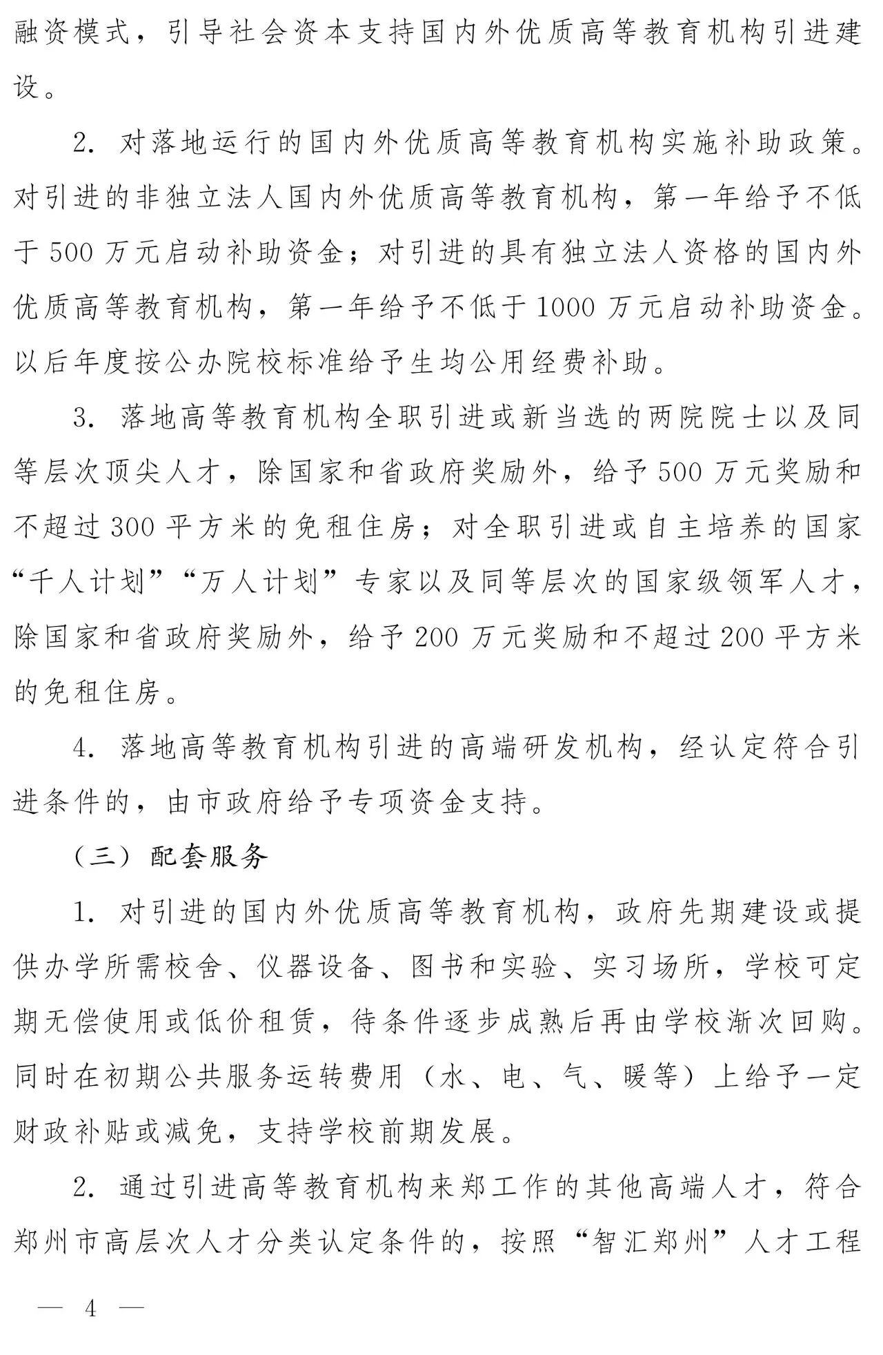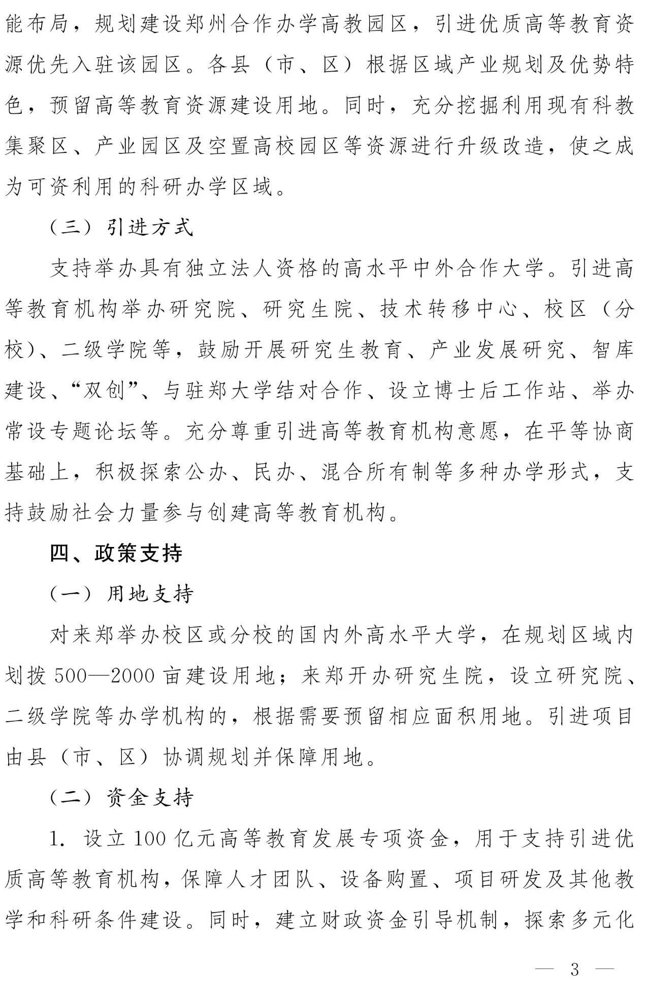 用地支持:对来郑举办校区或分校的国内外高水平大学,在规划区域内划拨500-2000亩建设用地;来郑开办研究生院,设立研究院、二级学院等办学机构的,根据需要预留相应面积用地。引进项目由县(市、区)协调规划并保障用地。