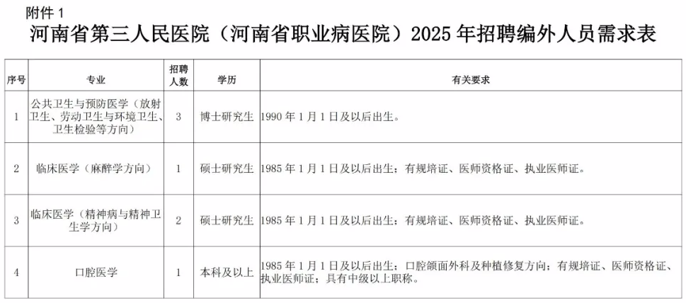 本次招聘编外人员7名,岗位详见:《河南省第三人民医院(河南省职业病医院)2025年招聘编外人员需求表》(附件1)。