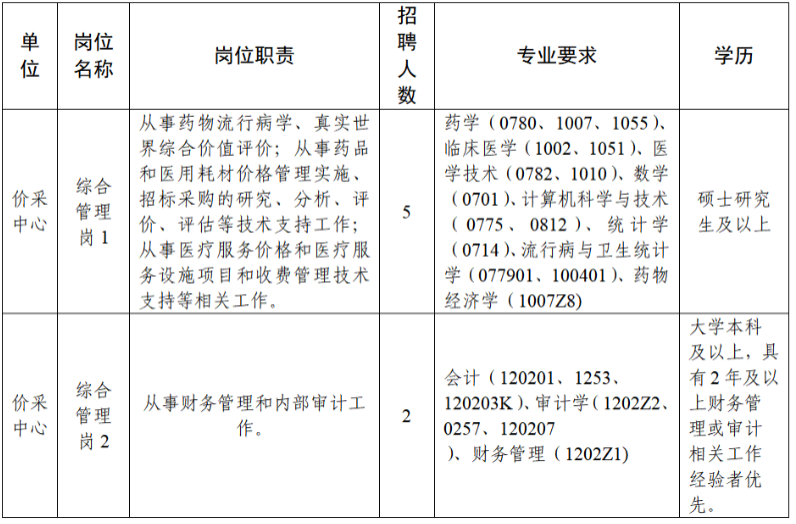 国家医疗保障局医药价格和招标采购指导中心(以下简称价采中心)是国家医疗保障局直属事业单位,主要承担制订医药价格技术标准规范、监测医药价格信息、协助指导省级医药招标采购平台建设和运行等工作。根据工作需要,现面向社会公开招聘合同制人员,有关事项公告如下: