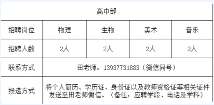 (1)有意者可直接联系田老师(电话微信同号:13937731883)投递简历,并在简历上注明“姓名+科目(岗位)+电话”如:张三高中语文 13xxxxxxxxx。个人简历须详细描述个人基本情况、学习经历、工作经历、获奖情况等,并附个人手机号码。