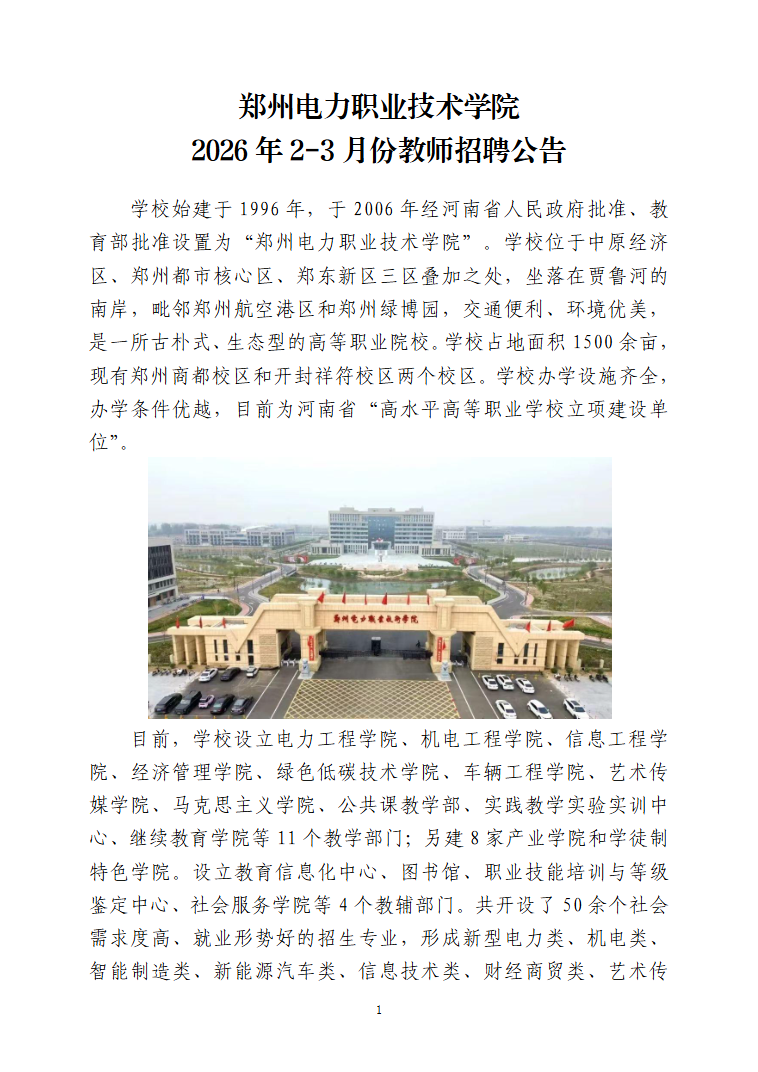 郑州电力职业技术学院2026年2-3月份教师招聘公告